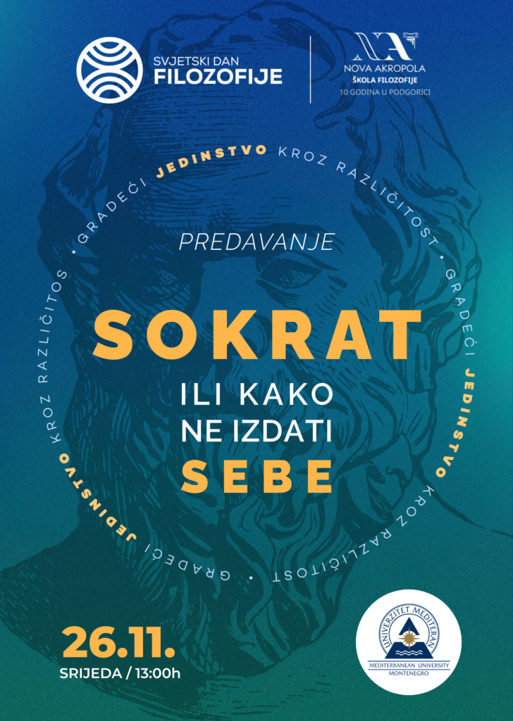 U srijedu 26.novembra u 13 sati biće održano predavanje “Sokrat ili kako ne izdati sebe” u saradnji sa Međunarodnom organizacijom Nova Akropola predstavništvo Podgorica.