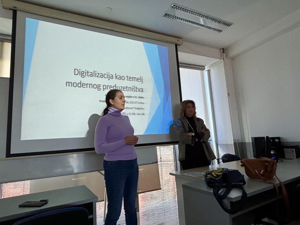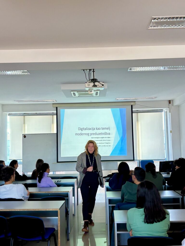 Danas je na Univerzitetu Mediteran Podgorica, u organizaciji MTSa i FITa, Dr Sandra Kordić, CEO ICT Cortex Crna Gora, održala vrlo inspirativno predavanje na temu “Digitalizacija kao temelj modernog preduzetništva” Posebno interesovanje pokazali su studenti FITa, koji su aktivno učestvovali u diskusiji i postavljanju pitanja. Zahvaljujemo dr Kordić na ekspertskom predavanju.